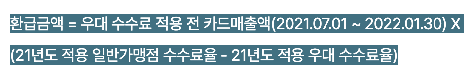 우대수수료율을 적용 받은 시점 전일까지, 일반가맹점수수료율로 납부한 금액을 계산해서 차액을 환급 받게 되는데 계산식은 아래와 같습니다.
