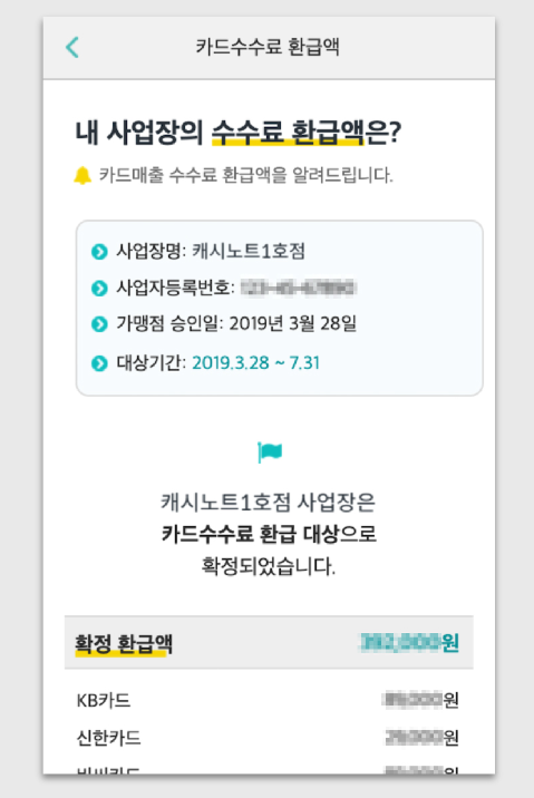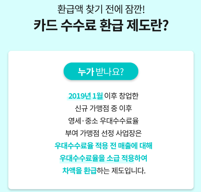 이렇게 일반수수료울과 우대수수료율을 차액을 환급해 주는 제도가 바로 "소상공인 카드수수료 환급" 제도로, 정부에서 2019년부터 시작해서 지금까지 매년 상, 하반기 대상자를 선정하고 환급을 해주고 있습니다.