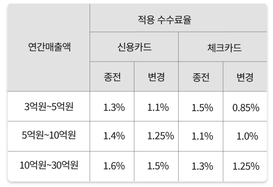 연간 매출액이 3억원을 초과하고 30억원 이하인 경우를 중소가맹점이라고 분류합니다. 또한 중소가맹점의 카드수수료의 기준은 아래와 같습니다.